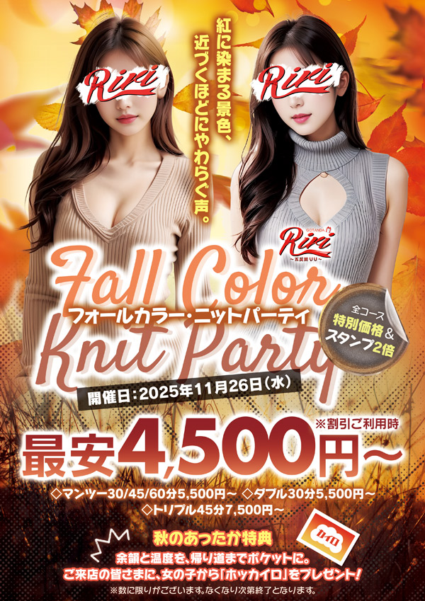 11/26(水)限定🍁紅に染まる景色、やわらぐ声に包まれて♡全コース特別価格&スタンプ2倍、最安4,500円〜!ご来店で“ホッカイロ”プレゼント♪※なくなり次第終了。 -